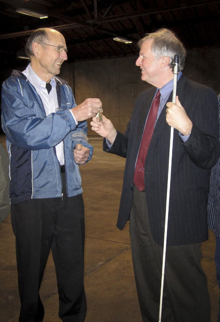Former building owner Chuck Travers (left) hands keys over to LightHouse CEO Bryan Bashin 05/04/2012 448 × 654 A New Building for Building Employment in the East Bay