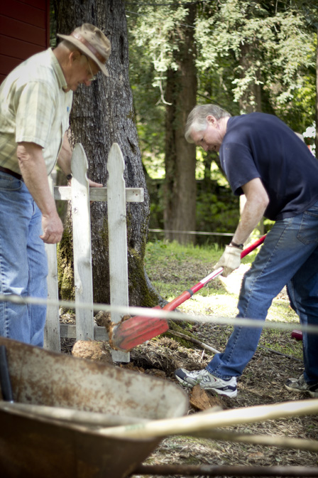 Kiwanis club members Ralph Giannini and his colleague John restore the fencing by the lakeside cabins 05/04/2012 448 × 672 Getting Ready for Summer – Volunteer Day at Enchanted Hills