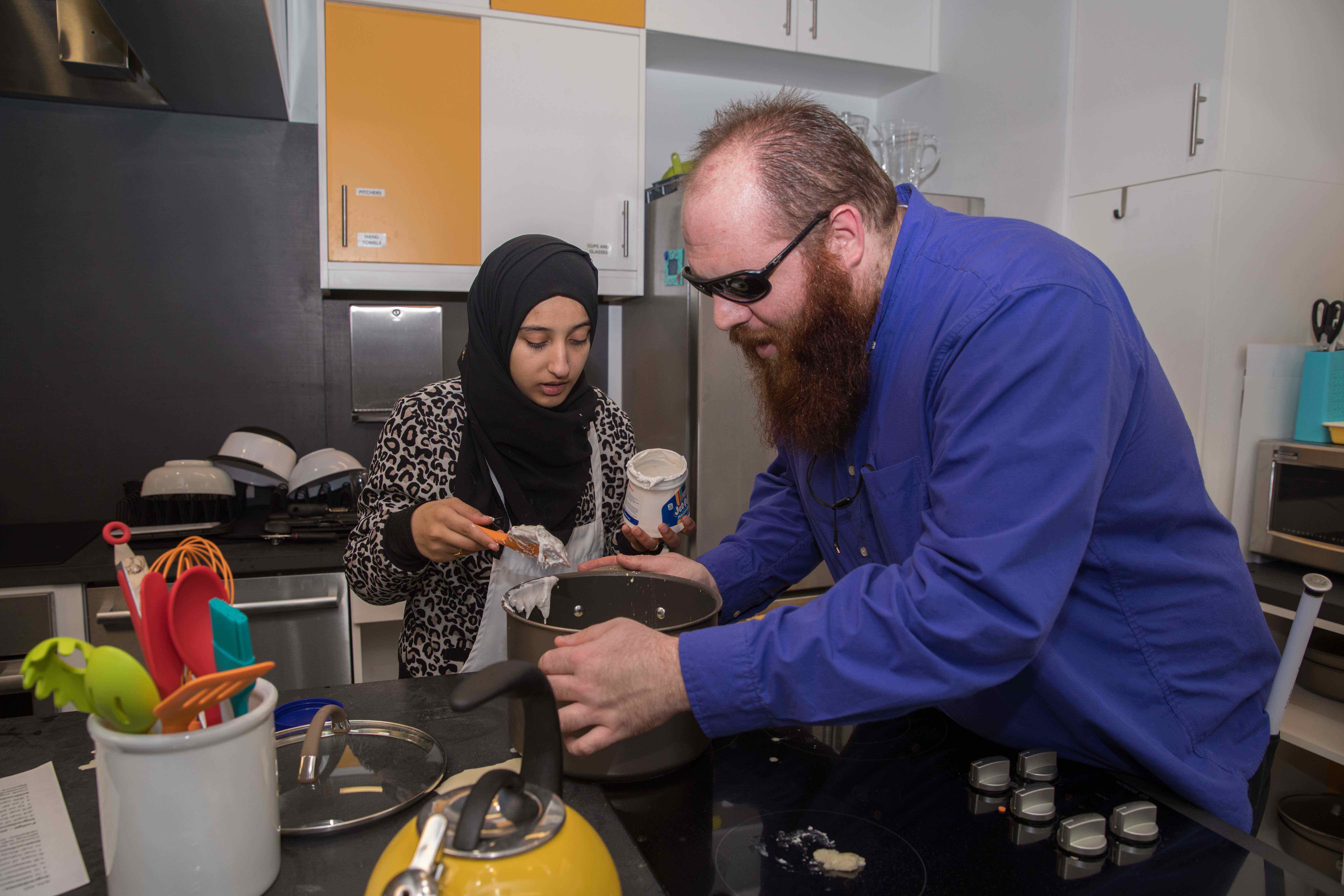 LightHouse Youth Services Coordinator Jamey Gump and student Jamila cook together during a Youth Employment Series.