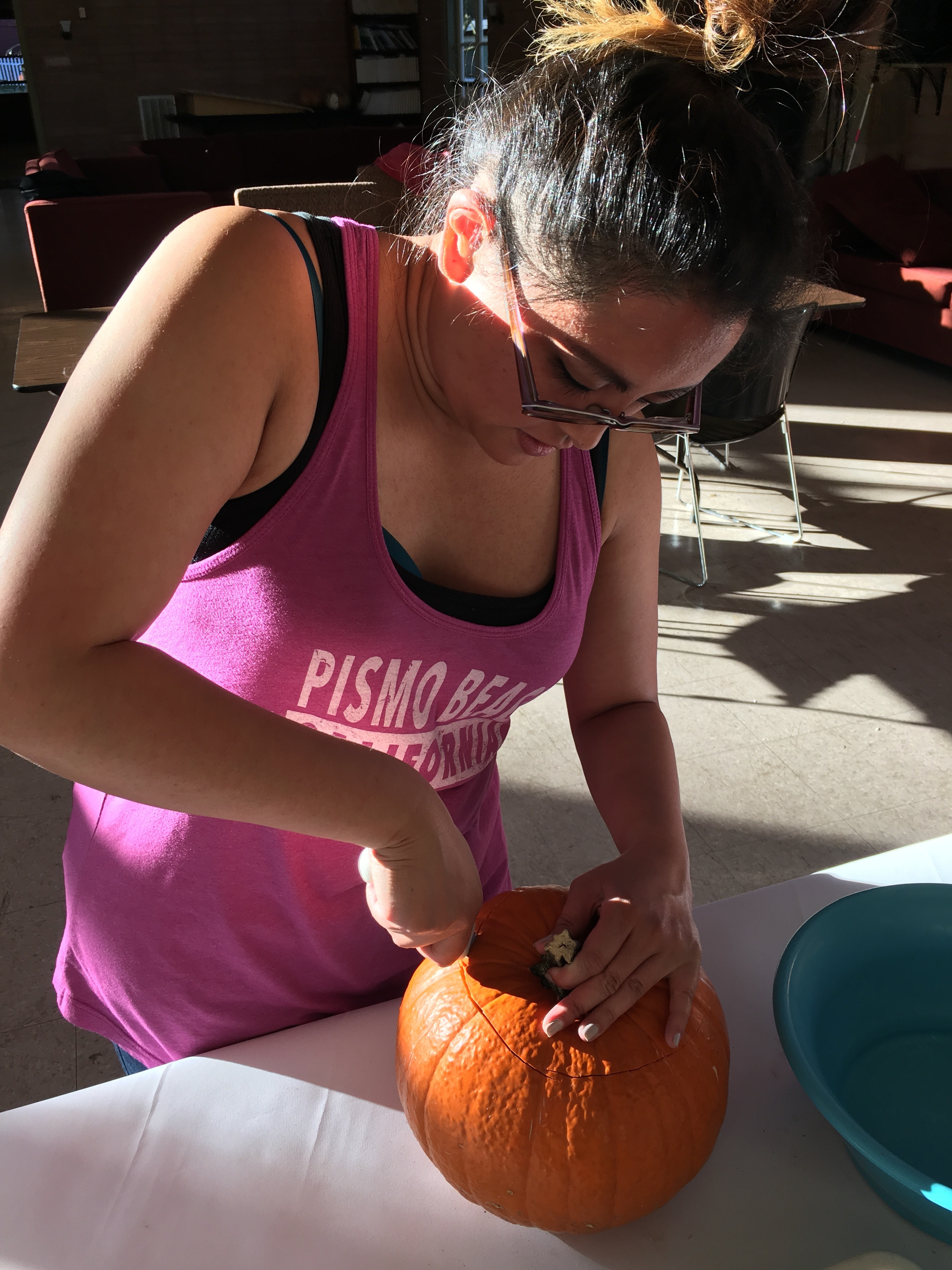 IMG_0284 10/30/2018 3024 × 4032 How to Carve a Pumpkin Non-Visually A young girl looks down at a pumpkin, secures the pumpkin with one hand and cuts into the pumpkin with her other hand.