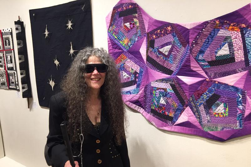 Claire Spector smiles and holds a white cane, standing in front of her work at "Blind Stitching: The Art of Sewing Differently" at Sebastopol Center for the Arts in 2018.