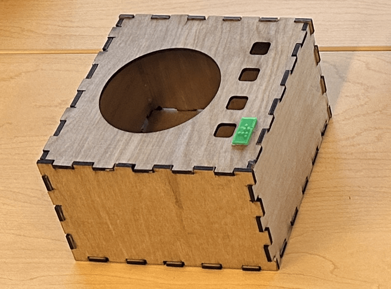 bus speaker closeup 05/15/2023 791 × 585 Latitude High Students Bring Their Inventions to LightHouse! A closeup of the prototype for a speaker that would attach to bus stops to give information about bus routes