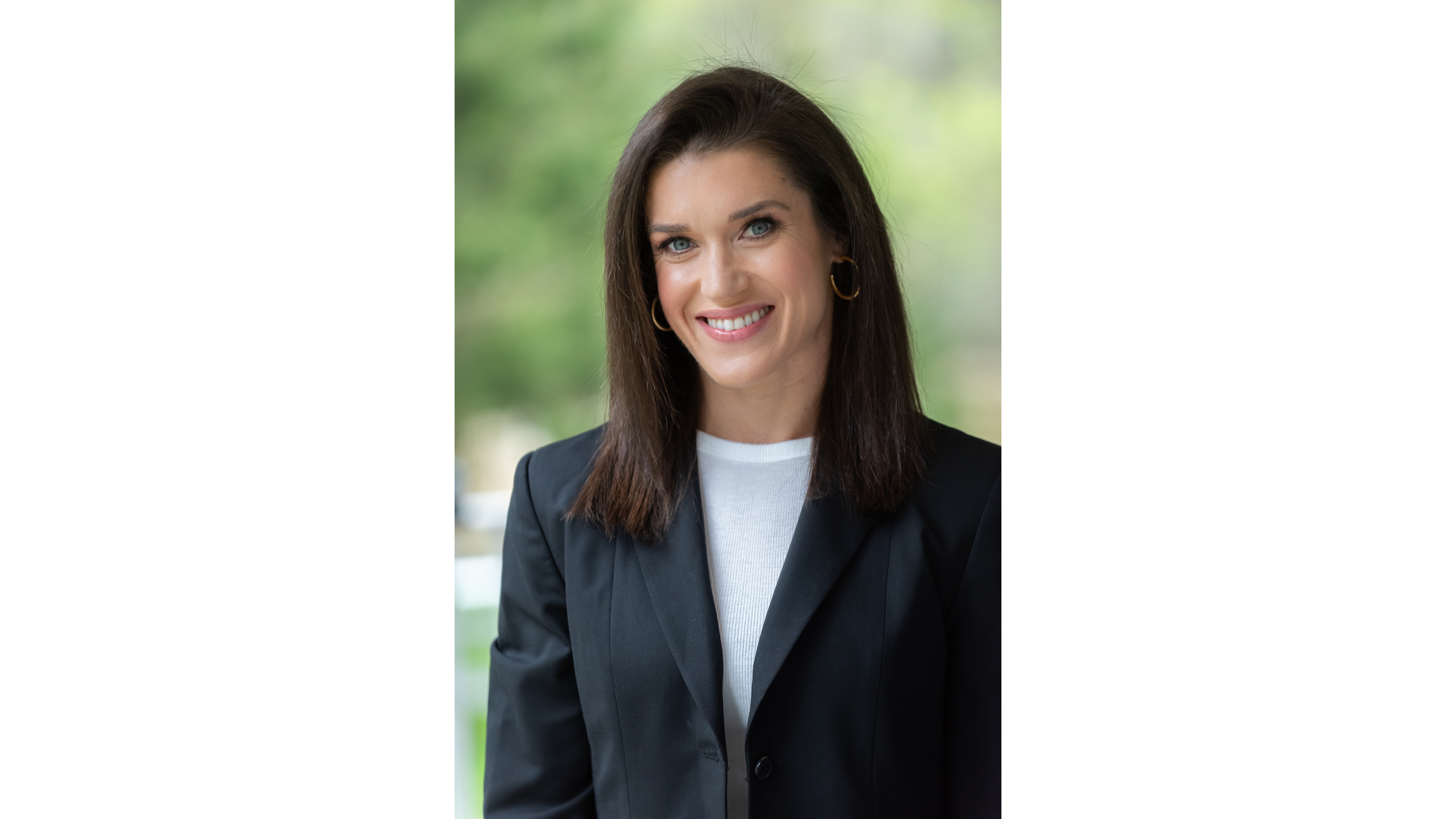 Rebecca Alexander is a woman with dark brown shoulder length hair and is wearing a white blouse under a black blazer.