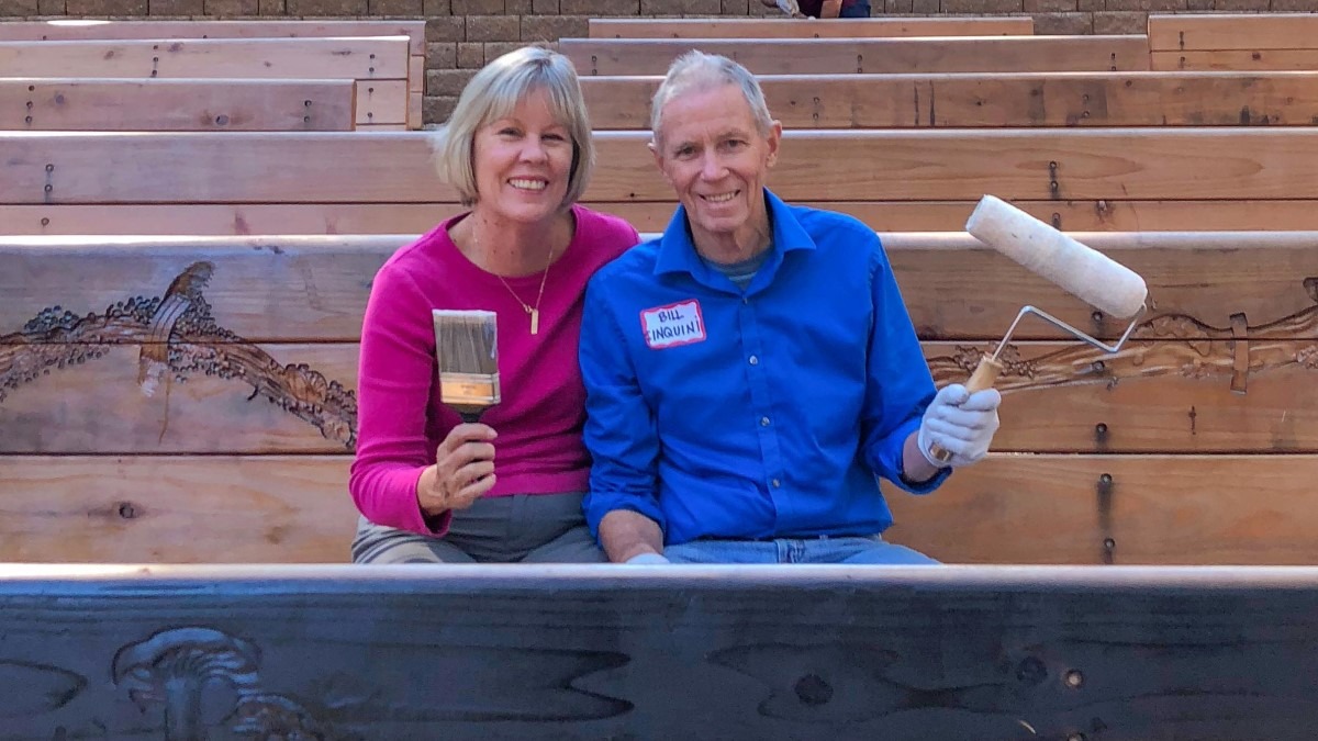 EHC Volunteer Day 04/11/2019 1200 × 675 EHC Volunteer Day Volunteers Laura and Bill Cinquini sit on a bench where the Redwood Grove is being rebuilt. Laura holds a paintbrush and Bill holds at paint roller.