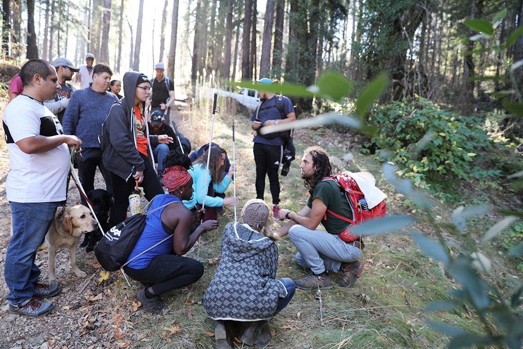 A group of blind and low vision campers with their white canes and guide dogs, exploring flora at EHC while the sun rays peeking through redwood trees fill the background. Photo by Sarika Dagar