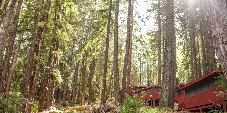 Sun filters through the redwoods over lower camp's red cabins.