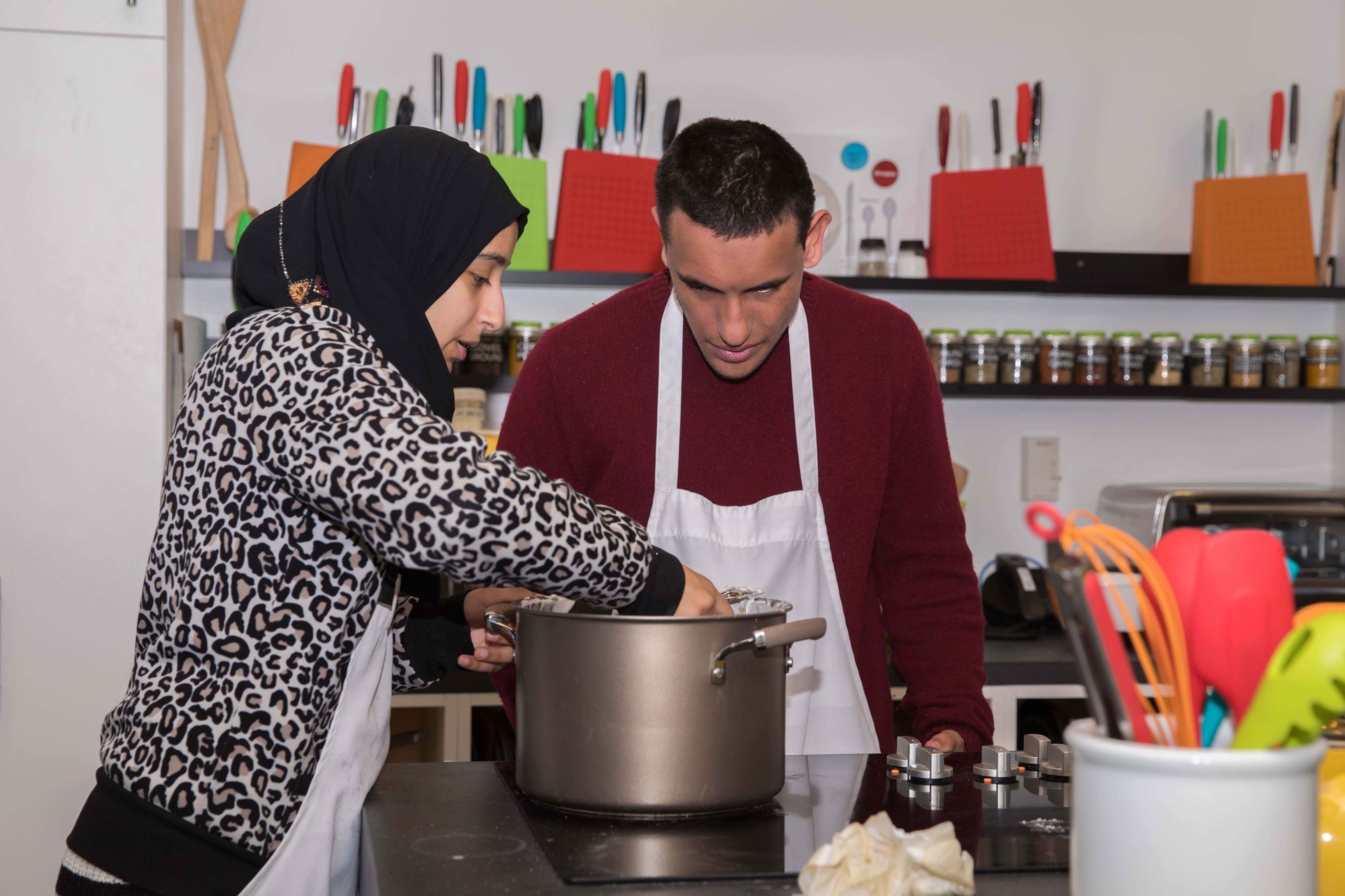 Estudiantes del programa YES en la cocina de LightHouse aprendiendo a cocinar.
