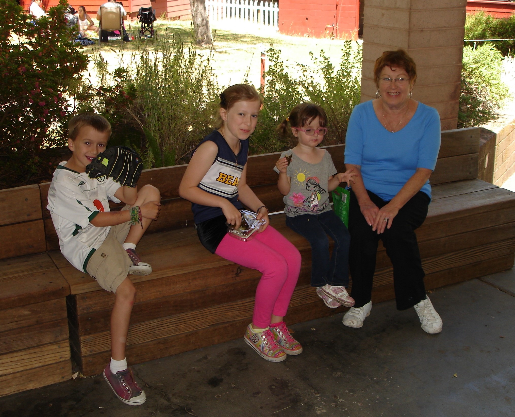 Sharing a quiet moment, a Grandmother sits on a bench next to her three smiling grandchildren, one of whom is wearing glasses.