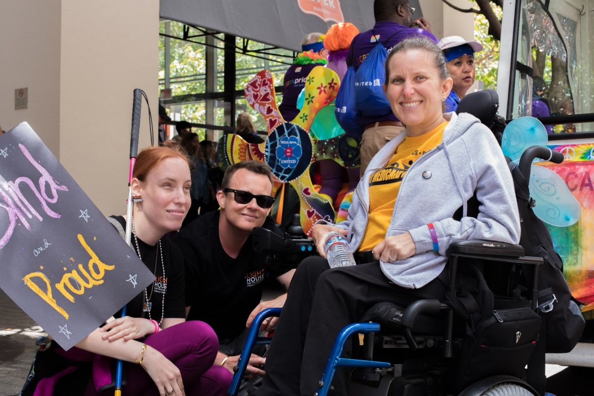 SF Pride 05/21/2019 1200 × 800 SF Pride Three people pose for a photo. The person on the left kneels and holds a white cane and a sign that reads “Blind and Proud. The person on the right is wheelchair user. Another person kneels between them.