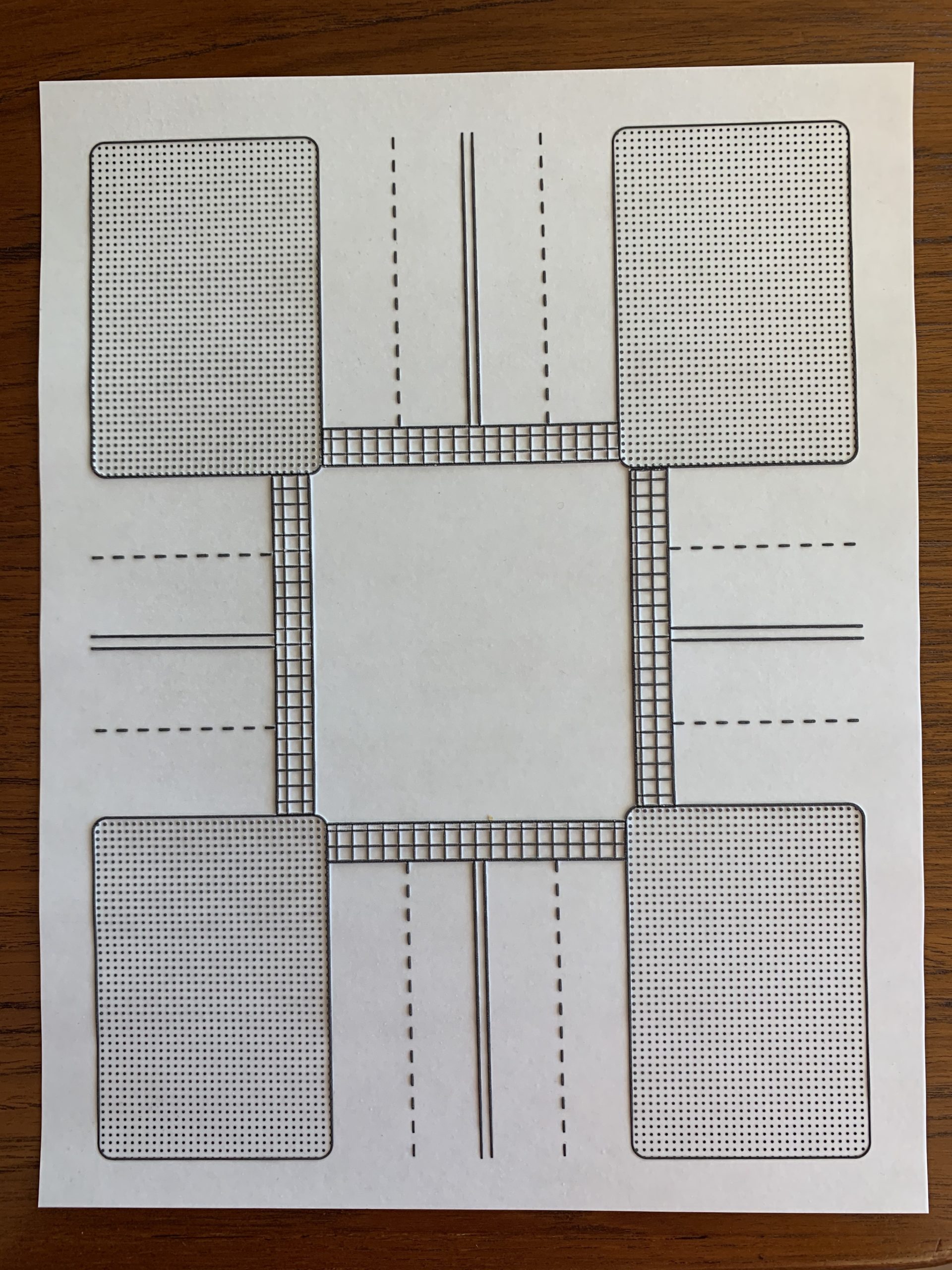 A tactile diagram of a typical four-way intersection with two lanes of traffic in each direction on each street; four city blocks are connected by crosswalks.